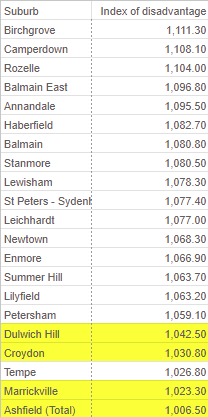 The four train stations council proposes for highest concentration of new density are among the give lowest advantage areas in the LGA. While they objectively have high amenity relative to most places in Sydney, it’s still a pretty bad look for council that places like Stanmore and Balmain are being roped off from new development. If you agree this is a problem you should say so in the comment boxes.